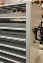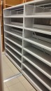 Спроектировали и произвели мобильные архивные стеллажи серии Л, адаптированные под параметры будущего помещения. С учётом пониженной высоты потолков была выбрана высота стеллажей 1621 мм, обеспечивающая удобную и безопасную работу без дополнительных приспособлений. Благодаря разборной мобильной базе стеллажи могут быть демонтированы и повторно установлены в новом здании без потери функциональности. Полки закреплены на быстросъёмных клипах, что позволяет сотрудникам самостоятельно регулировать их расположение под форматы А4 и А5. Использованы двусторонние конструкции с разделителями, предотвращающими смещение архивных книг между ячейками хранения.