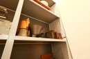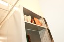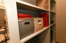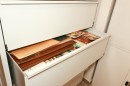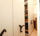 Совмещение в одной секции стеллажа закрытых и открытых полок, выдвижных ящиков и штанги под одежду, относительно запроса заказчика, для дальнейшего удобства в работе с экспонатами.